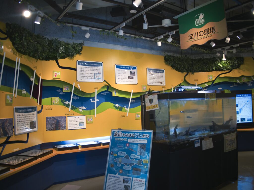 資料館内の「淀川の環境」のコーナーにはいくつかの水槽が設置されておりナマズやウナギなど淀川に棲息している魚類の展示があり魚たちの様子を間近で見ることができます。