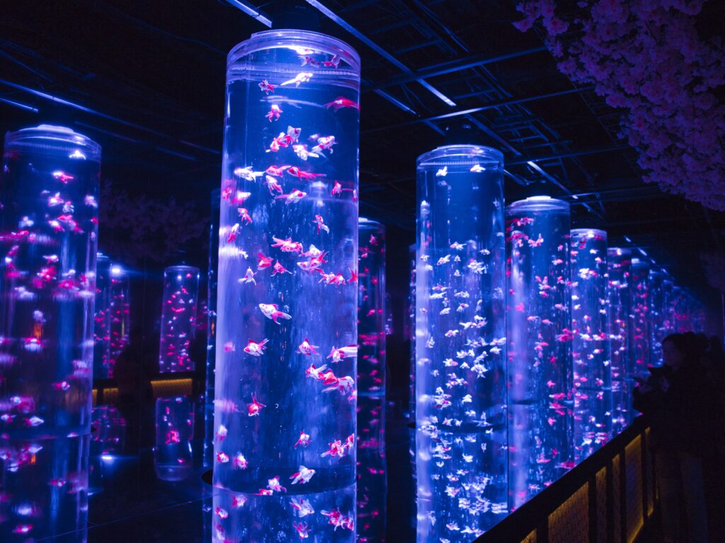 魚の色彩や体型、水槽の形状や照明環境を「インテリア」や「アート」として活用している水槽設備が多いです。