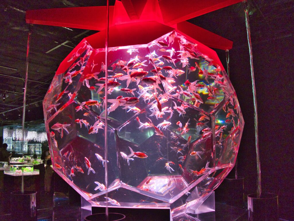 「アート」としては「アートアクアリウム」というような名前で、展示していることが多く、金魚やメダカなどの改良品種の用いた展示をしている場合が多いです。フナはまずいません。