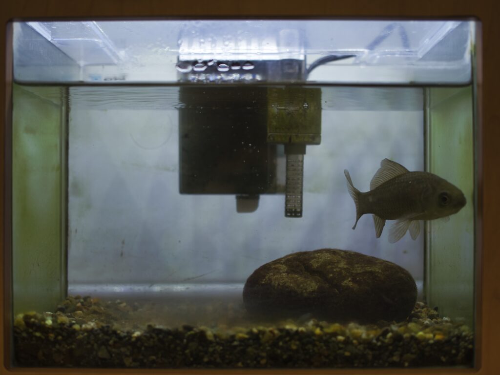 水槽の濾過には小型の外掛け式フィルターが使われており、レイアウトは大きな石が1つ置かれているだけという非常にシンプルな構成です。