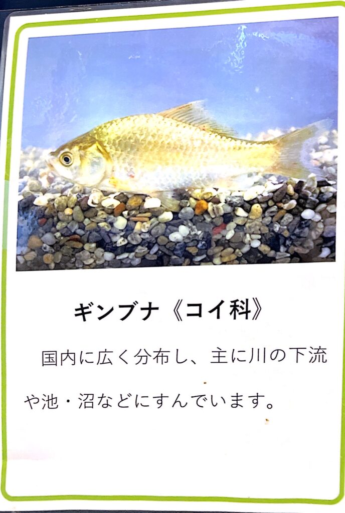 そこには、在来種のフナの姿が紹介されており、ほかにはグッピー(外来種)やカワニナ、タニシなどの貝類も確認できます。