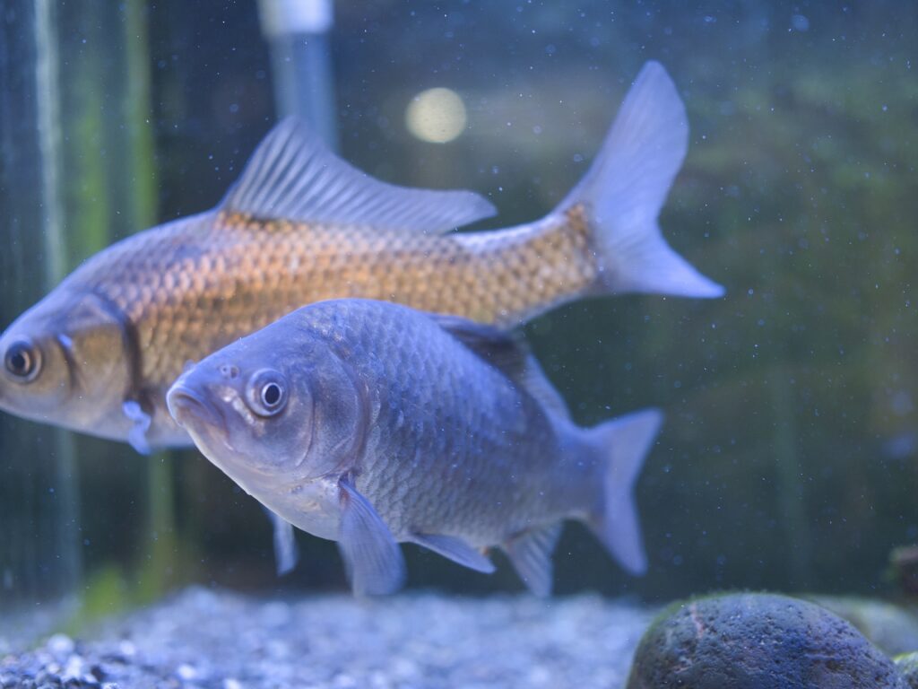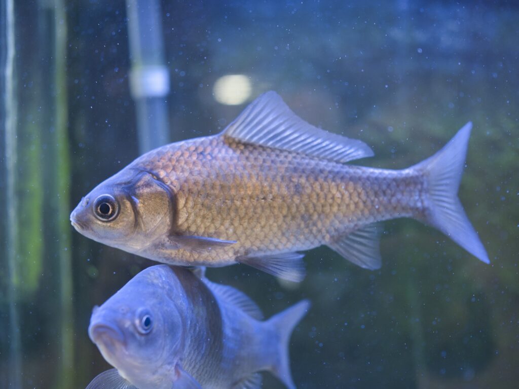展示名は「ギンブナ」とされていますが、実際には1匹はゲンゴロウブナ(ヘラブナ)と思われます。