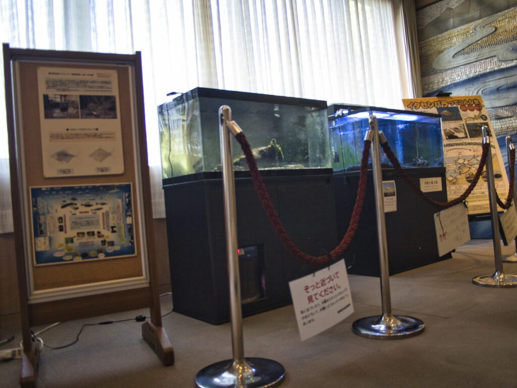2階の展示スペースには、地域の自然と生きものを伝える水槽が設置されており、