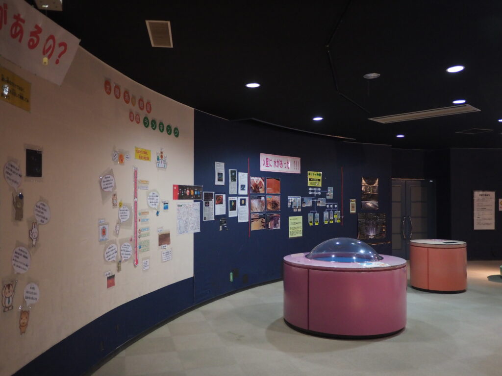 1階の常設展示室では「宇宙を目指す人間生活」をテーマに、惑星や月のパネル展示があり、無料で見学できます。