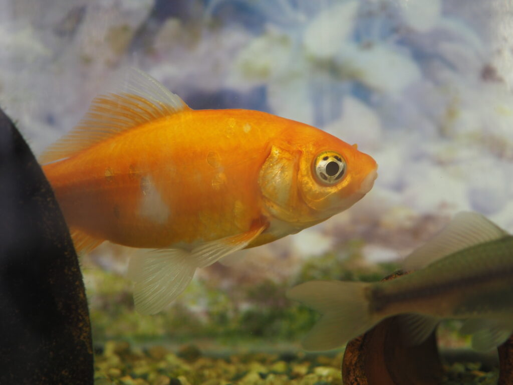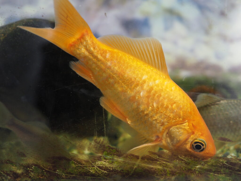 さらに隣の水槽では、金魚や通常のフナに混じって、透明鱗フナが多数飼育されていました。これらの透明鱗個体は体長10cmほどの小型で、やはりカメラを向けるとすぐに物陰に逃げていきます。