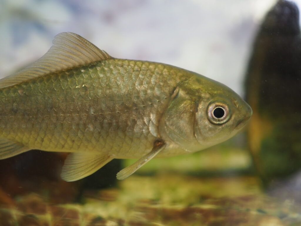 水槽内のフナには個別の種名表記はありませんでしたが、体形や色合いから見て「ギンブナ」であると推測されます。