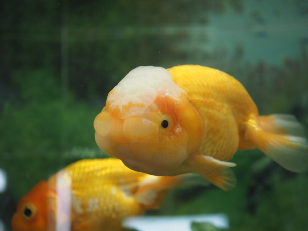 その他の水槽では、更紗和金や蘭鋳といった金魚品種も飼育展示されており、どれも体格がしっかりした立派な個体ばかりです。