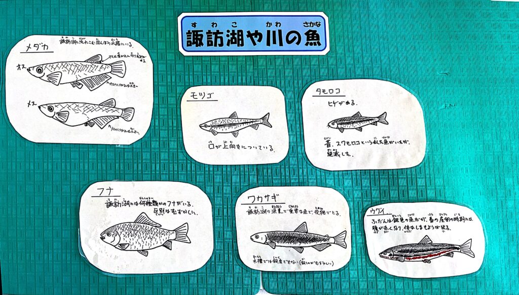 水槽の横には、諏訪湖や川に棲む魚たちについての解説パネルも設置されています。