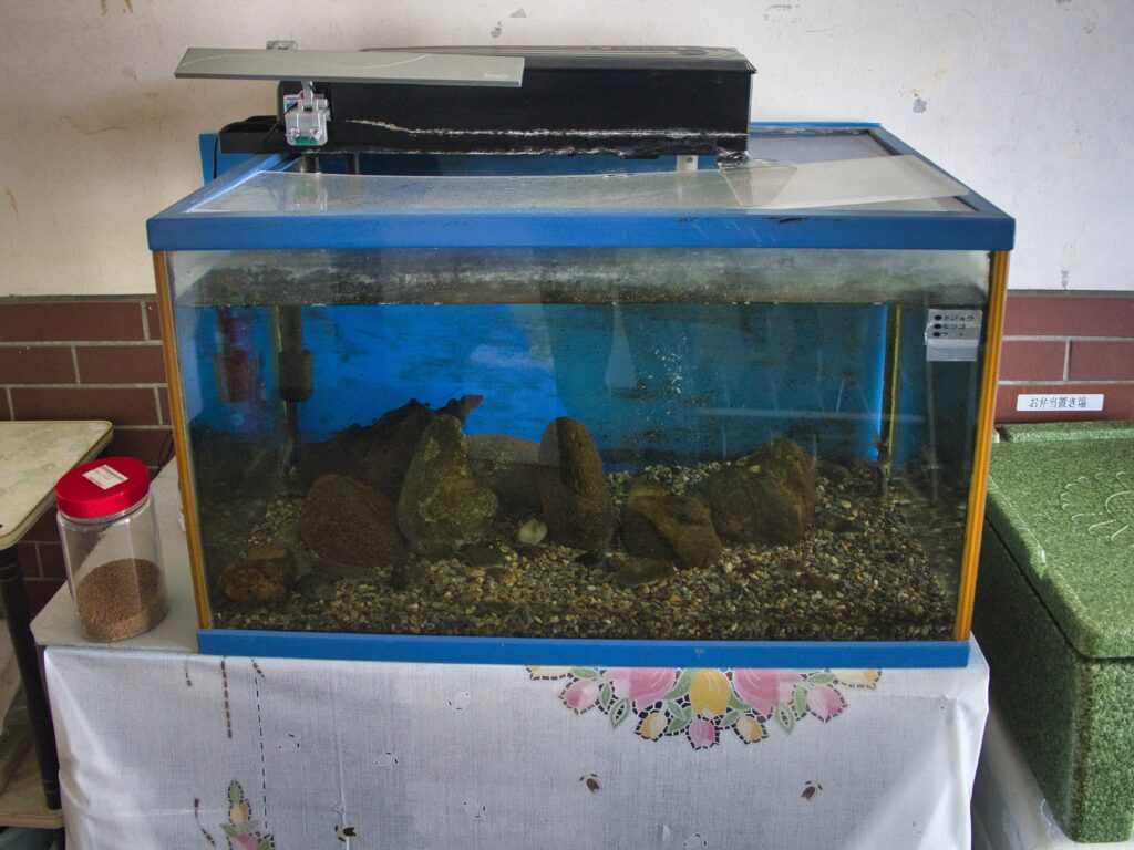 水槽内は全体的に暗く、入り口から差し込む日光でかろうじて照らされている程度でした。できれば照明を設置してほしいなと感じました。