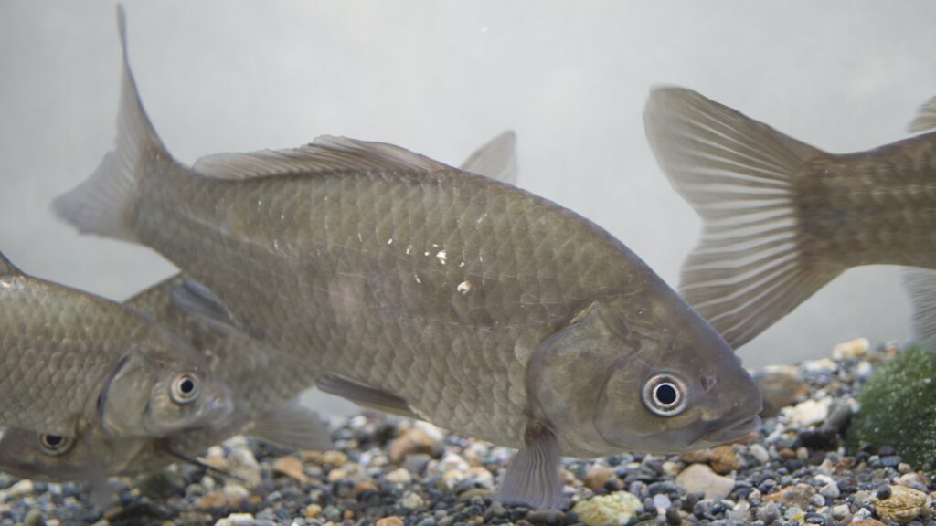 古くから飼育・放流されてきた大型の魚で、湖や池、河川などにすみます。雑食性で、水生植物や小動物も食べます。