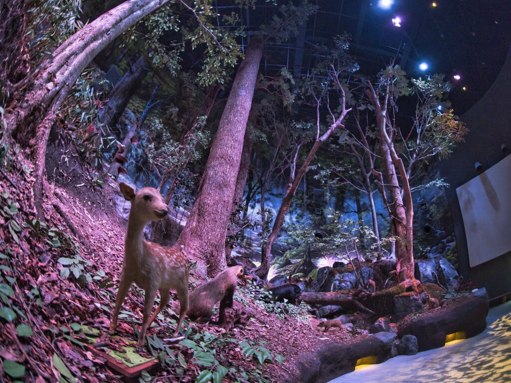 館内では、源流の森を再現したジオラマや巨大スクリーンによる映像展示、大型水槽での生き物の観察が楽しめます。