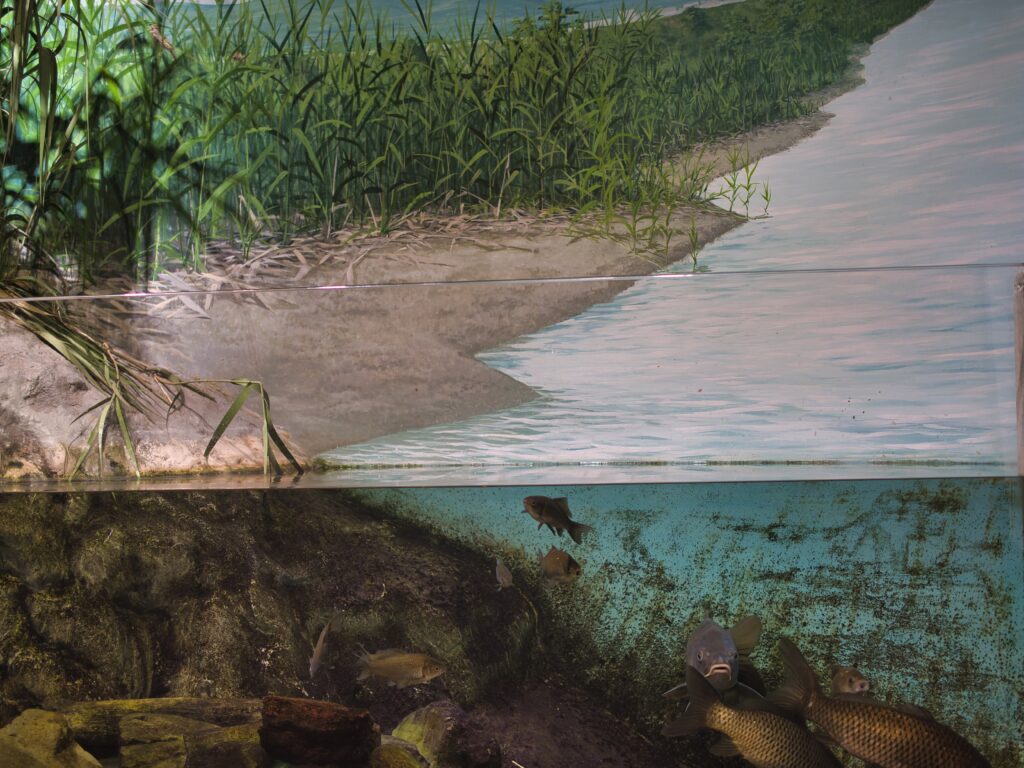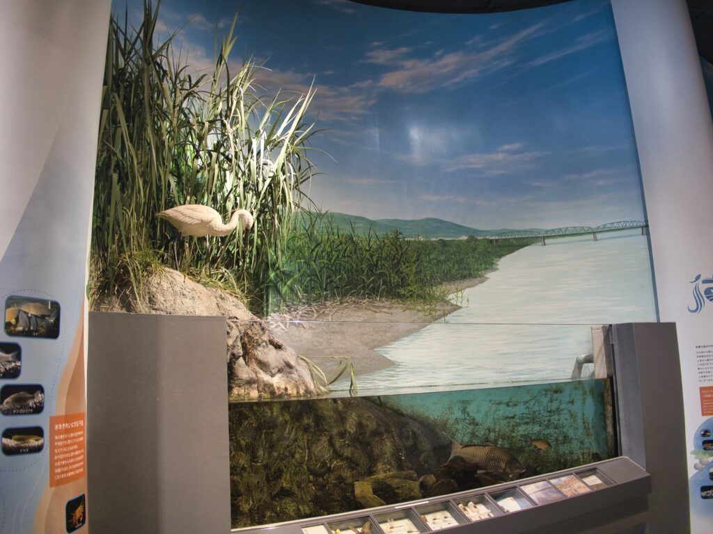それぞれの水槽にはジオラマが組まれており、上部には地域の流木やヨシ、そして外敵となり得る鳥の標本が展示されています。