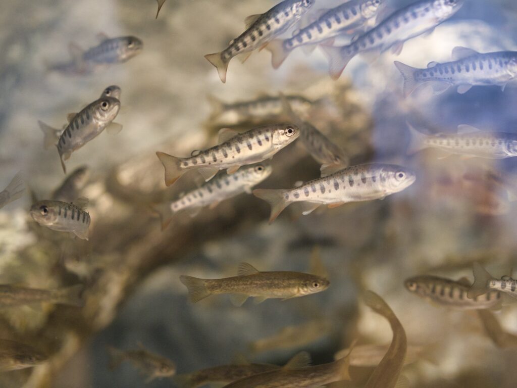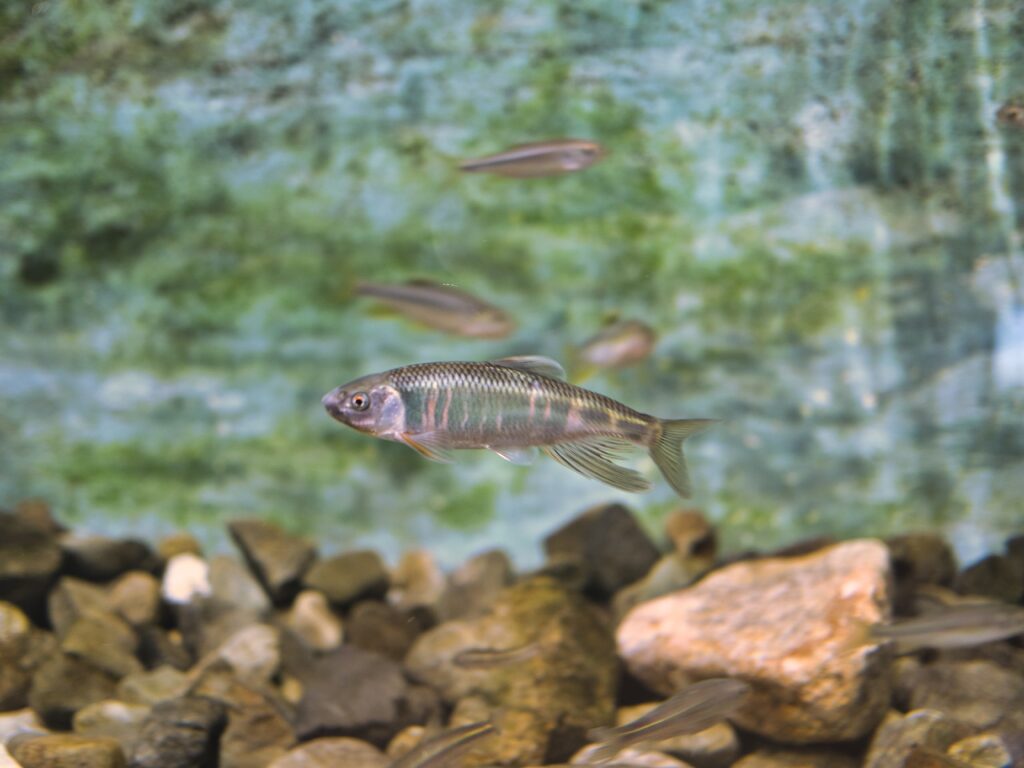 上流にはアマゴ、中流にはアユと婚姻色のでたオイカワが泳いでおり非常に美しい水槽です。