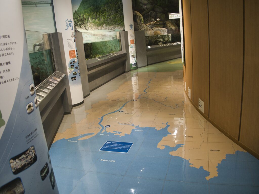 水槽の縁には、各地域に生息する昆虫や底砂の標本も並べられており、さらに足元の床面には、川上村から始まり、和歌山県の紀ノ川河口まで続く川の流れが映し出されています。