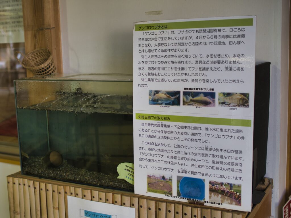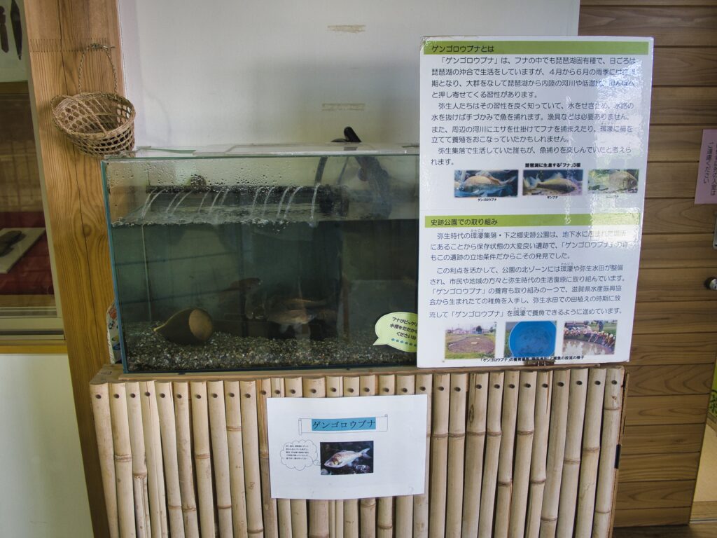 ここは弥生時代の環濠集落を再現した歴史公園なんだけど、なんとフナの展示もあるんですよ。