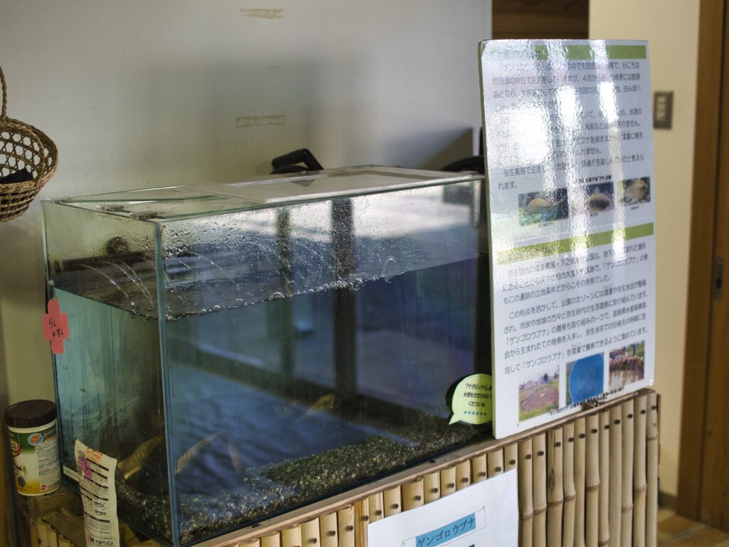 フナを単独で展示している水槽は、地域の資料館や展示施設では意外と少なく、ここでの展示は非常に貴重です。