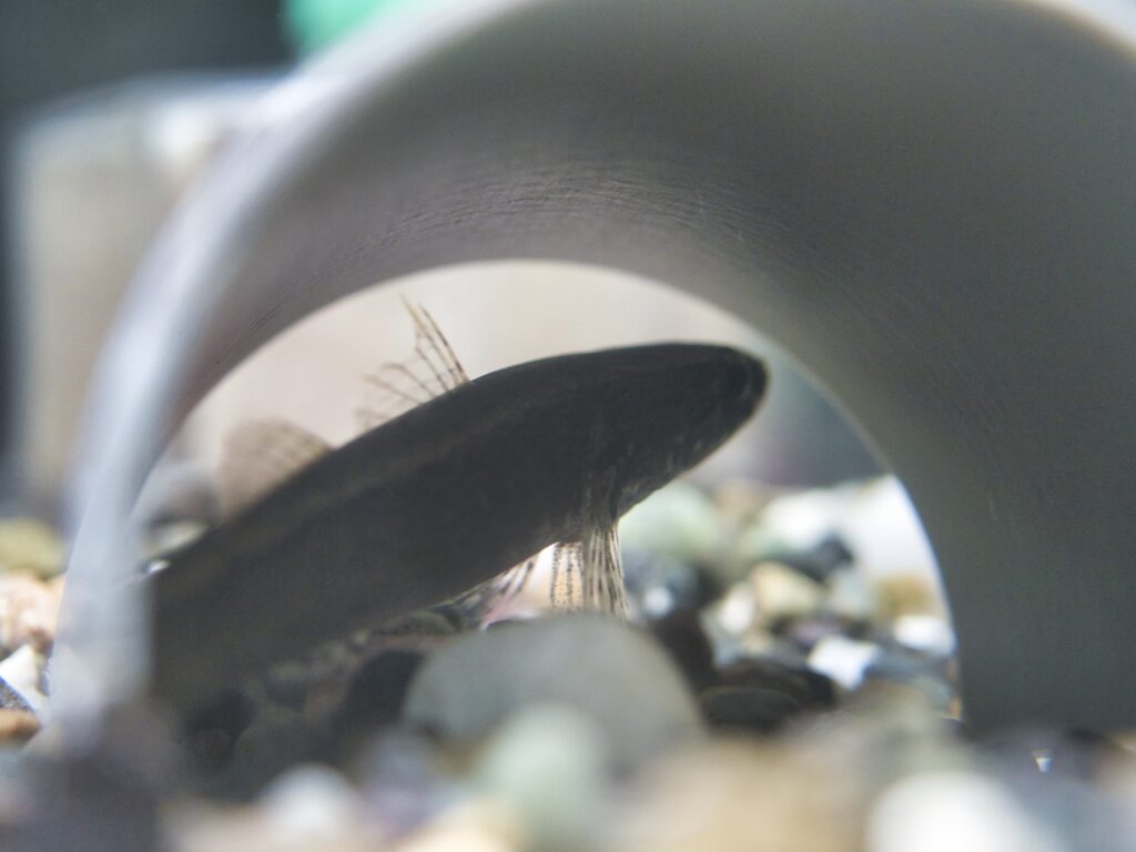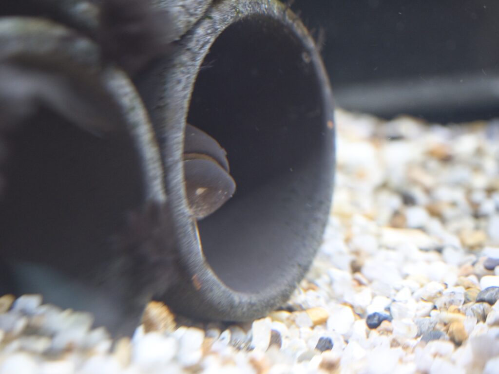 水槽は砂利と岩のみのシンプルな構成で、投げ込み式フィルターと上部ろ過を併用しており、水質管理も良好です。