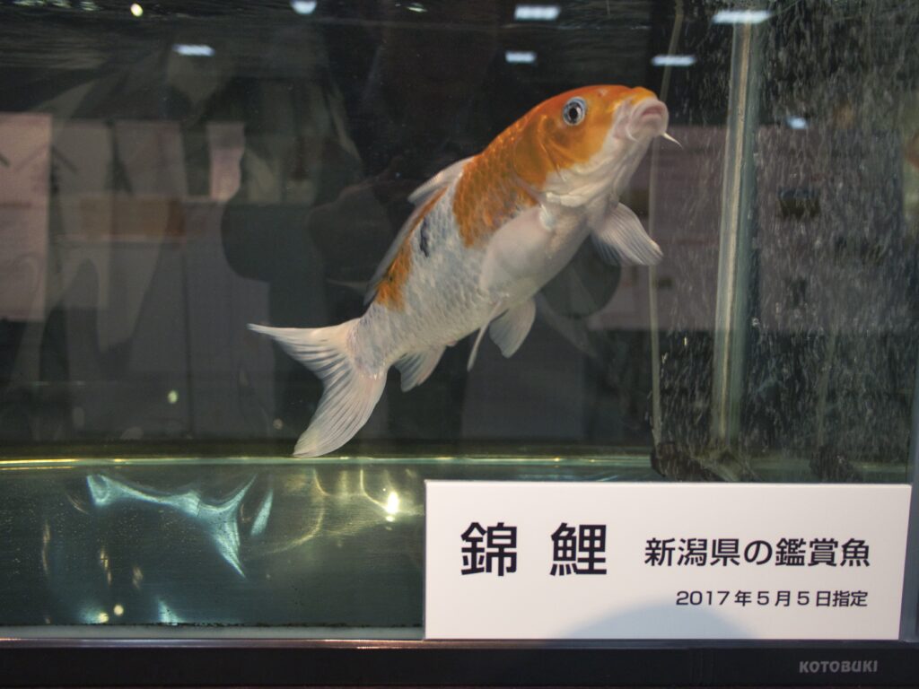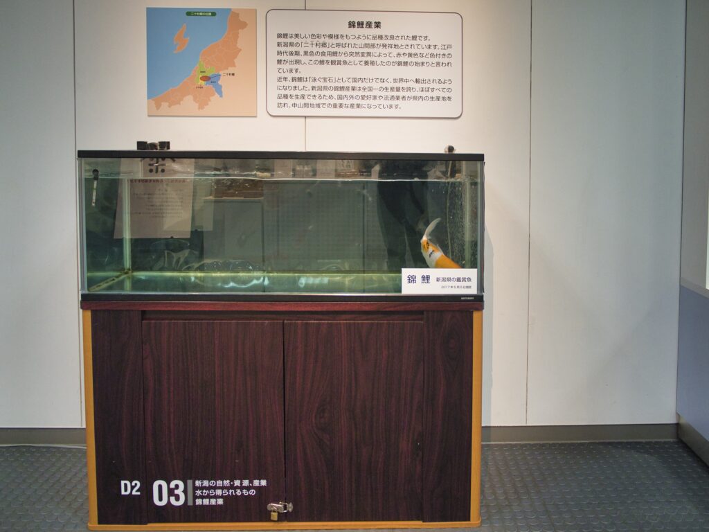 さらに「新潟県の移り変わり」コーナーには、県を代表する魚として錦鯉の水槽展示もありました。新潟の文化と水産業を象徴する存在として、来館者の目を引いていました。