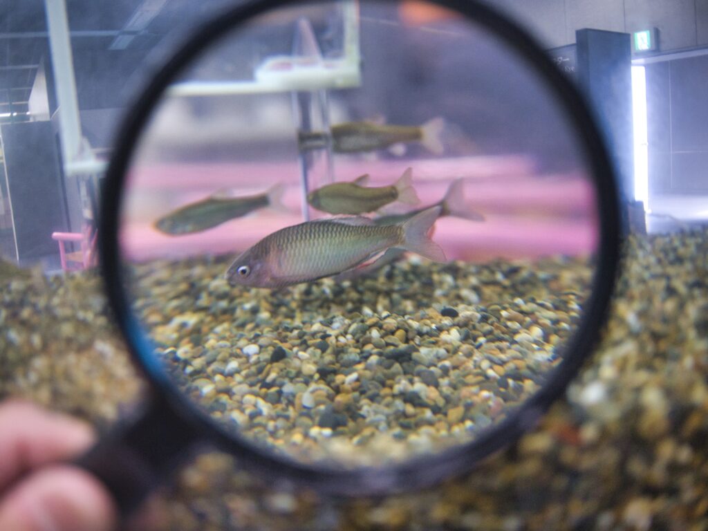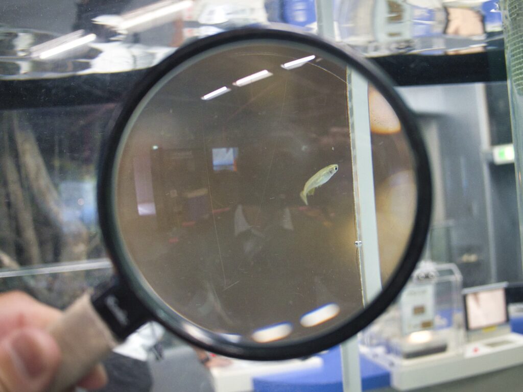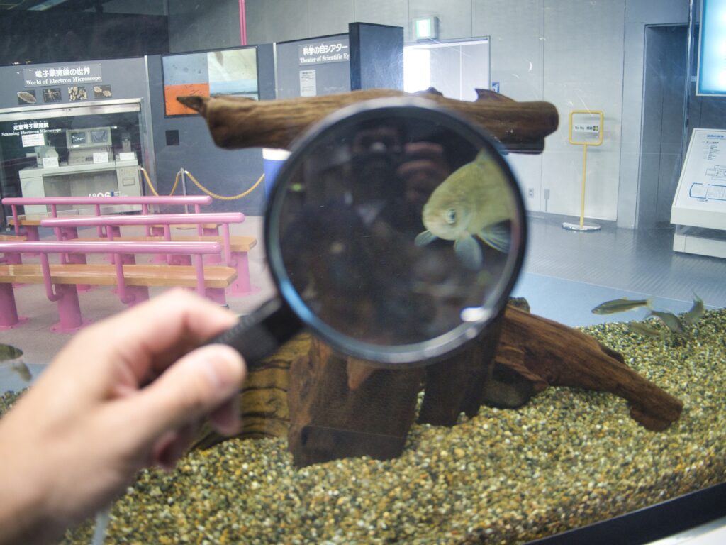 ただし、魚たちは活発に泳ぎ回るので、虫めがね越しに観察するにはやや不向きかもしれません。