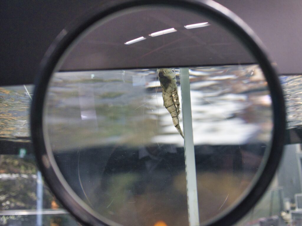 水槽の端にはサテライト水槽があり、そこにはキタノメダカとスジエビが展示されていました。