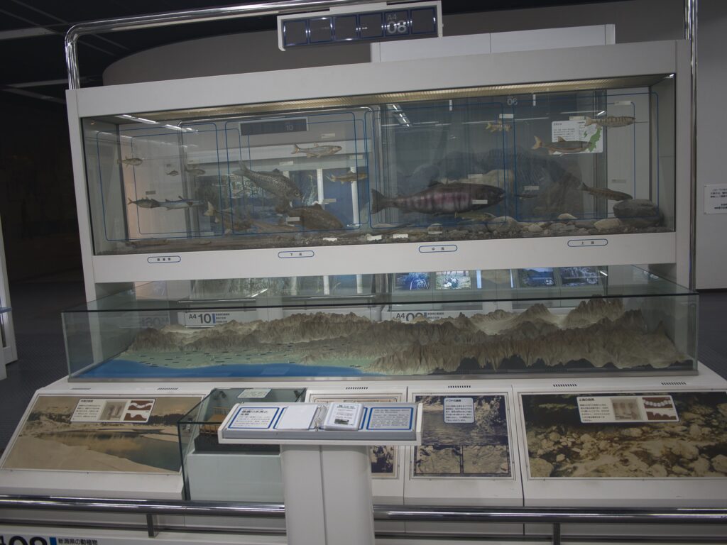 新潟県内の河川を上流から河口まで順に紹介する展示の中で、中流から下流域に生息する魚として取り上げられており、比較的大きな個体が選ばれていました。