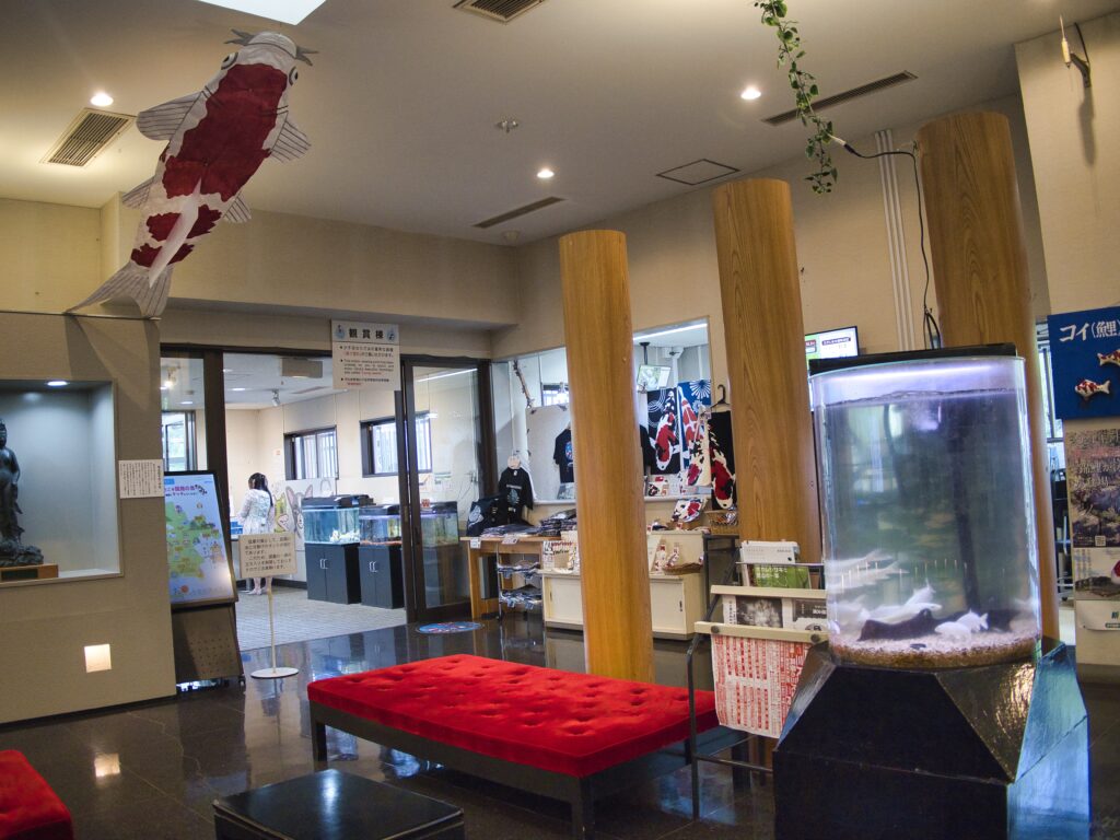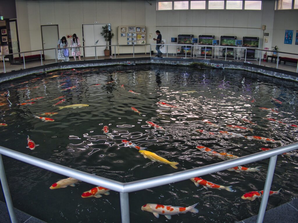 屋内の観賞池では、約40~150尾、15品種ほどの錦鯉が泳ぎ、多くの品種を間近に観察できます 。展示室では、多言語パネルや映像で錦鯉の歴史からライフサイクル、品種のバリエーションまで解説されており、英語ナレーション付きビデオも視聴可能です 。