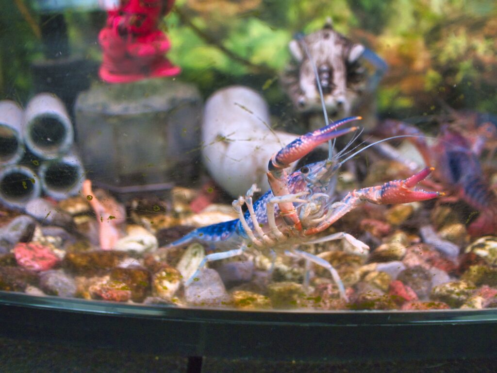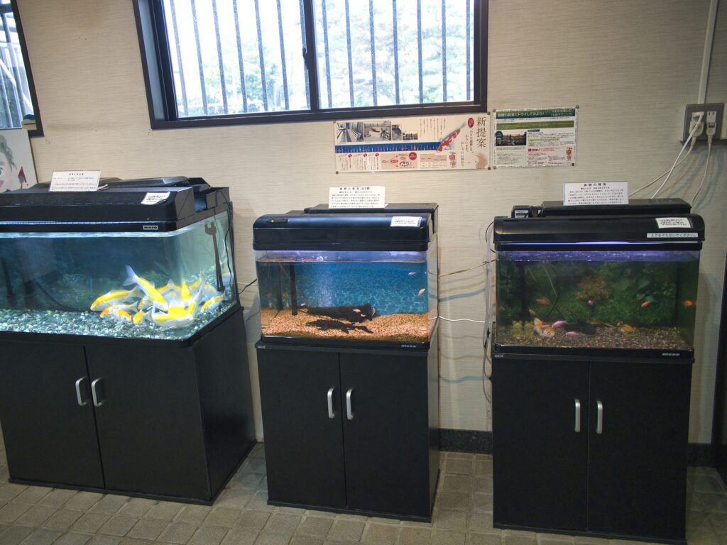 鑑賞池の側面には8基の展示水槽があります。ここでは品種ごとに分けられた未成魚の錦鯉や、新潟で生産される金魚「玉サバ」、さらには青色のザリガニ、タモロコ、ヤリタナゴといった淡水魚も紹介されています。展示の多様さは見ごたえがありましたが、