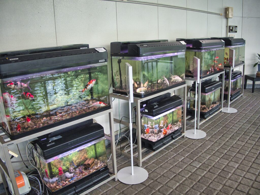 それぞれに生まれて間もない稚魚、1歳、2歳といった年齢ごとの錦鯉が展示されており、成長の過程を一目で比較できる展示です。