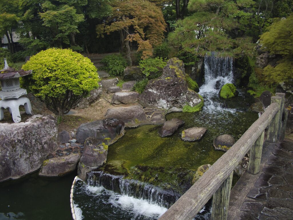館外には日本庭園が広がり、滝や橋を配した水辺に多くの錦鯉が泳いでいます。屋内に比べて透明度はやや劣るものの、水質は良好で魚の状態も非常に良い印象です。自然景観と錦鯉の組み合わせが訪れる人を癒してくれます。