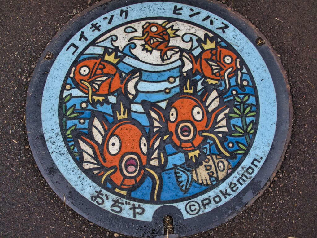 「錦鯉の里」のすぐ近くには、ちょっと特別なマンホールがあります。そこには、人気ゲーム『ポケモン』に登場する「コイキング」と「ヒンバス」がデザインされているのです。どちらも鯉をモチーフにした水タイプのポケモンであり、まさに錦鯉の文化と結びつく存在といえるでしょう。