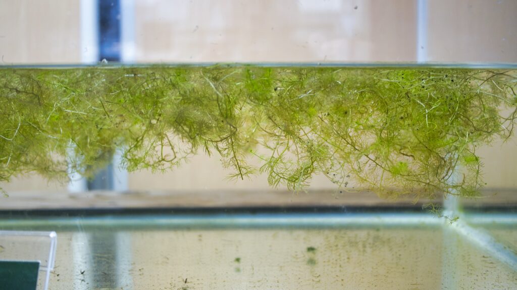 半円柱の水槽には、アヌビアスやミクロソリウム、ウィローモスなど陰性植物が多く植えられています。
