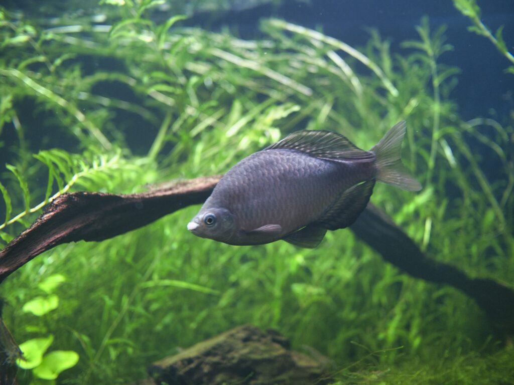 富栄養な水域を想起させる展示で、フナの姿を想像させましたが、実際に泳いでいたのはグッピー程度。