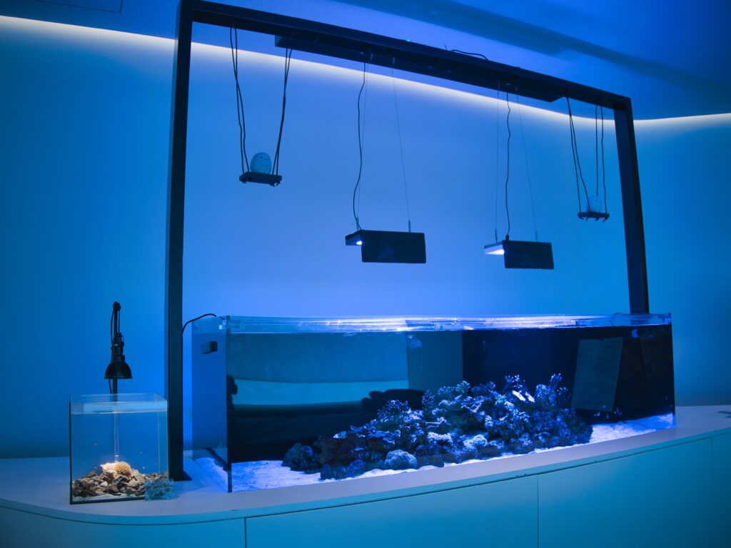 店内はダークブラウンとブラックを基調とした落ち着いた空間で、各席にはブルーライトに照らされた水槽が設置され、まさに“大人のレストラン”といった雰囲気。
