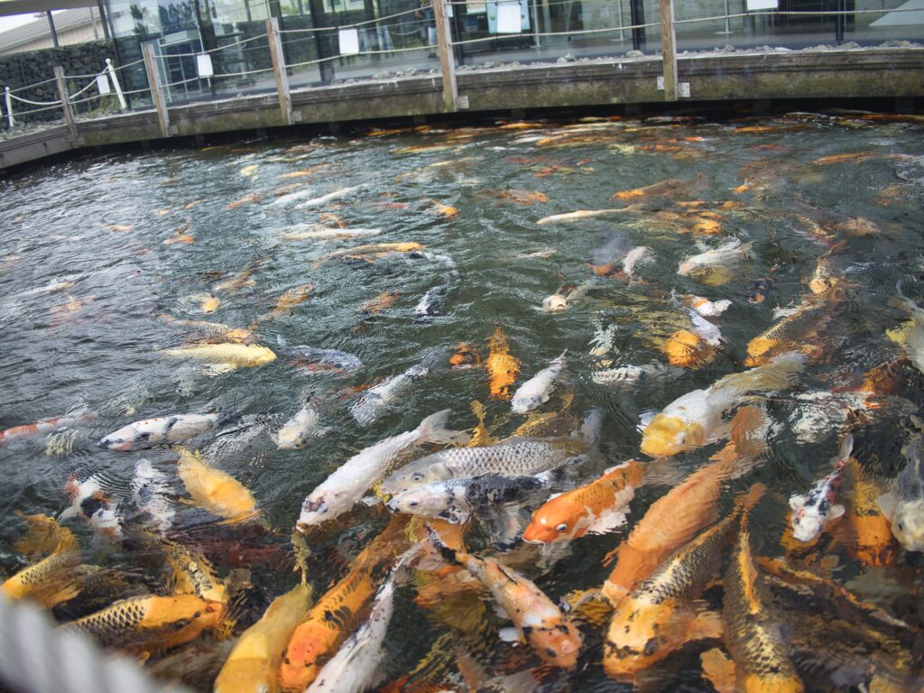 さすが新潟、発色や模様が際立つ美しい錦鯉が群れを成して泳いでおり、見ごたえ十分でした。観覧者に寄ってくる人懐っこさも魅力的ですが、現在は節水のため餌やりが休止中とのこと。