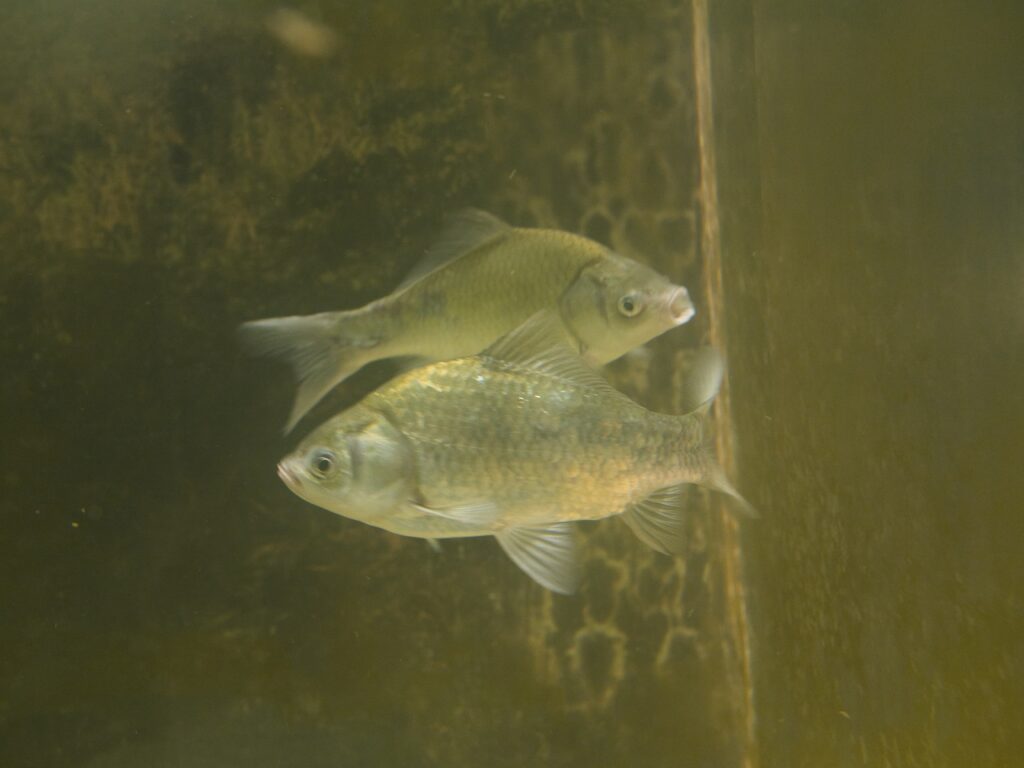 ところが、そこに泳いでいたのはまさかのフナ。体高が高く、ヘラブナの特徴を示していました。