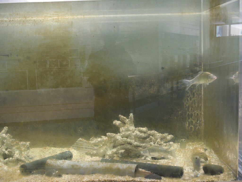 入口の水槽は以前はフナやモツゴが泳いでいるだけのシンプルなベアタンクでした。装飾もほとんどなく、魚をただ観察するための空間といった印象。