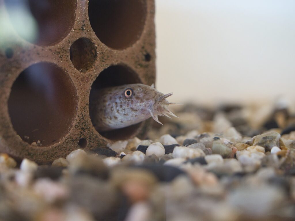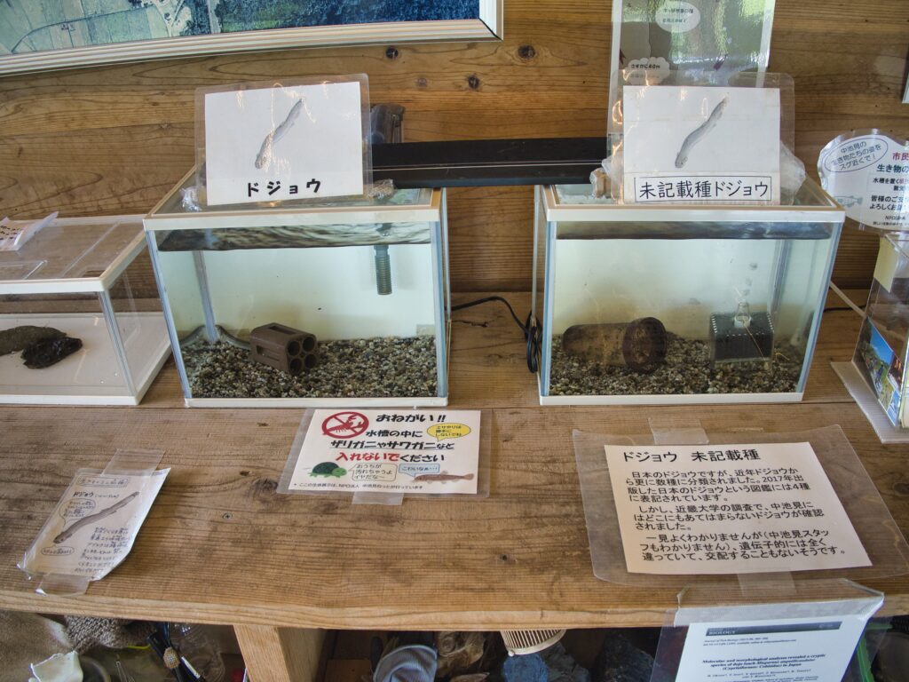 未記載種の地域固有のドジョウが展示され、隣には一般的なドジョウも配置。