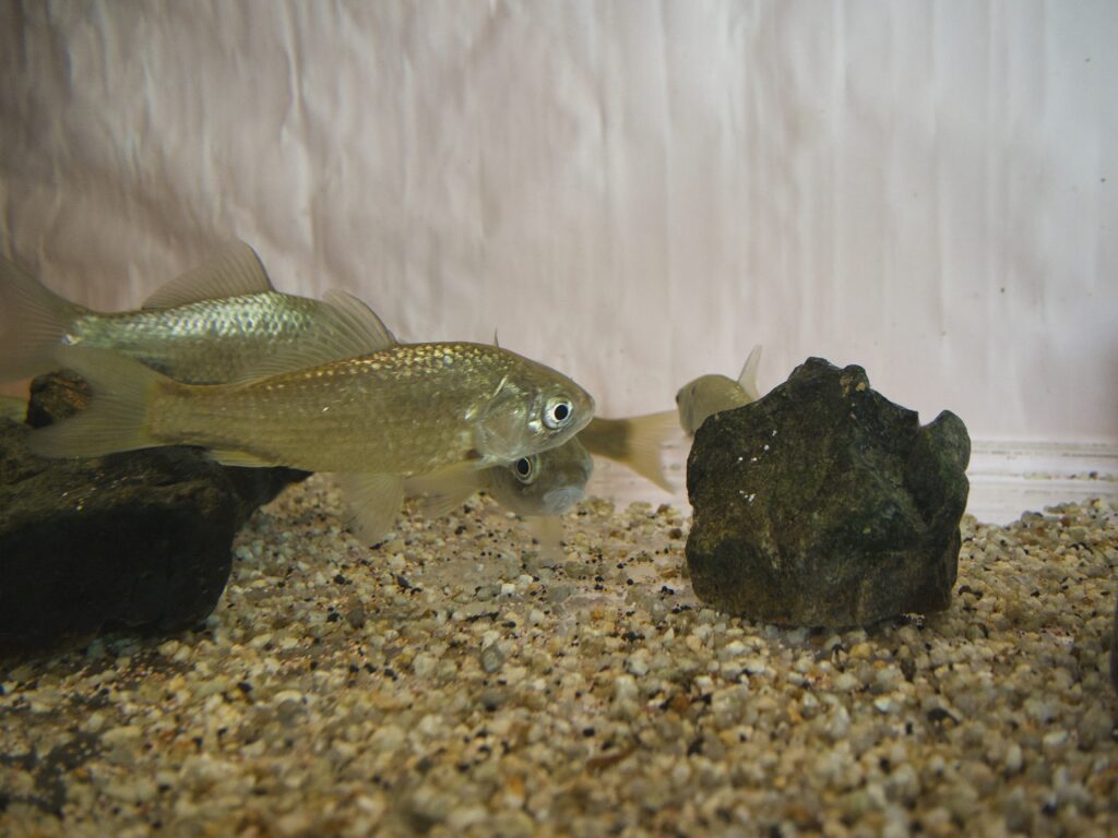 水槽内のアクセサリーは石のみでシンプル。自然環境の再現というよりは「観察のしやすさ」を重視した展示です。展示されているフナは10cmほどとやや小型で、ショートボディのように体形が丸みを帯びた個体も。中には体高が低めの個体もいて「ナガブナ」の可能性も考えられます。