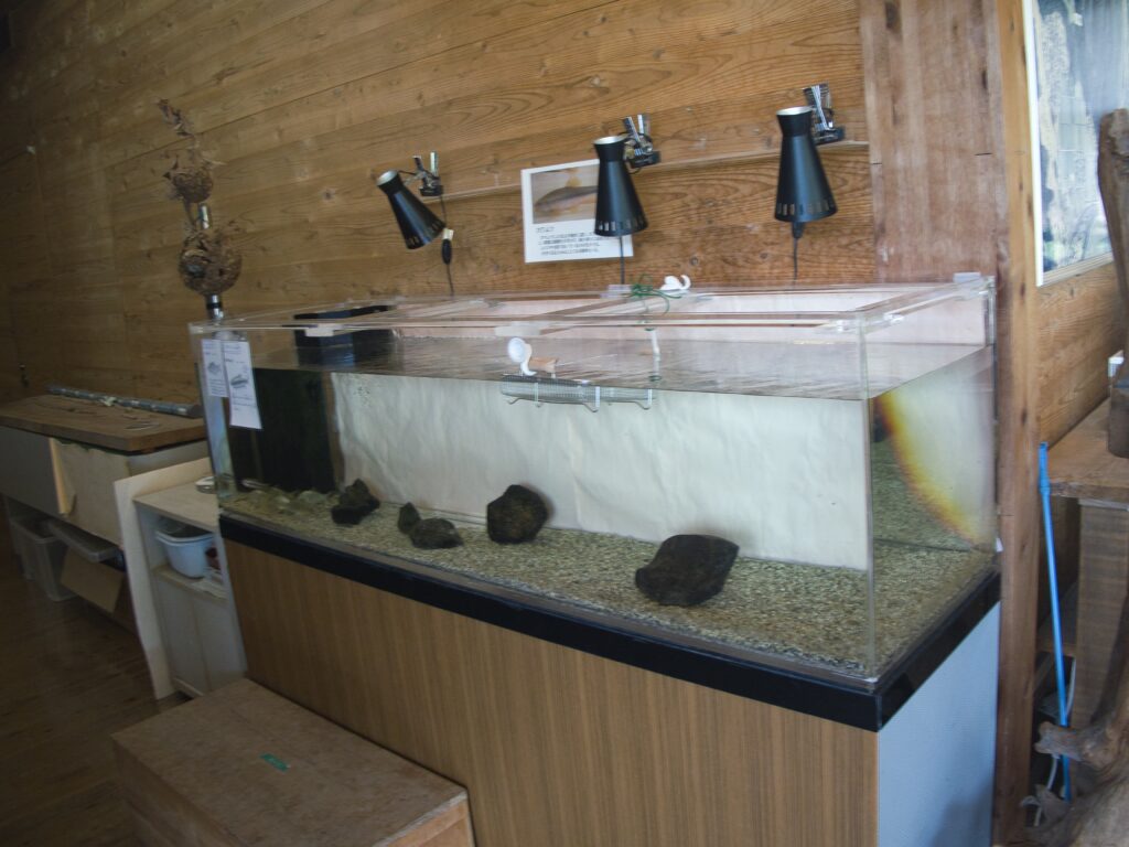 施設内には「ミニ水族館」と呼ばれるコーナーがあり、180cmの大きな水槽が設置されています。この水槽は60cmごとに三分割され、上段・中段・下段に異なる生き物が展示されています。