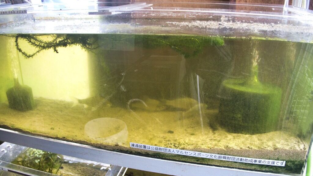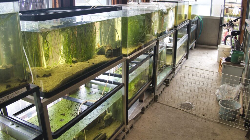 屋外にも多数の水槽が設置されており、そこではメダカやタナゴなど、より小型の淡水魚が飼育されています。