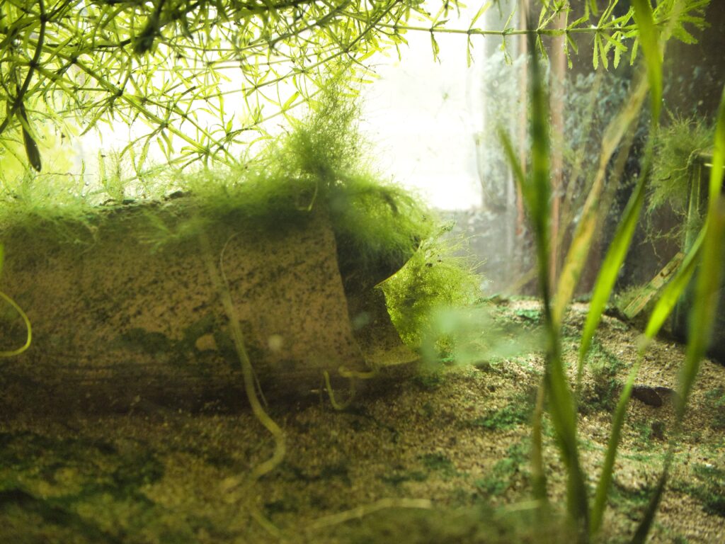 水槽の底には、明るい田砂のような淡い色の砂が敷かれています。水草も多く植えられており、自然光の下で育つそれらは非常に生き生きとしていました。