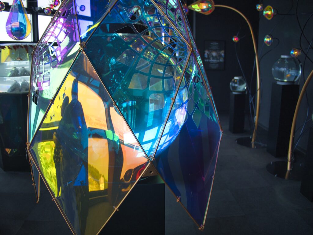 半球型のアクリル水槽に和金系の金魚が泳ぎ、壁面にはプロジェクションマッピング。