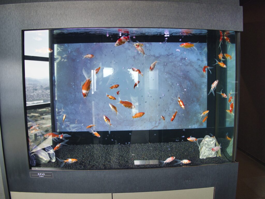 テーマは“天空”で、展望ガラス面に薄型水槽を組み込み、外の空と金魚の泳ぐ姿が一体化するよう設計されています。