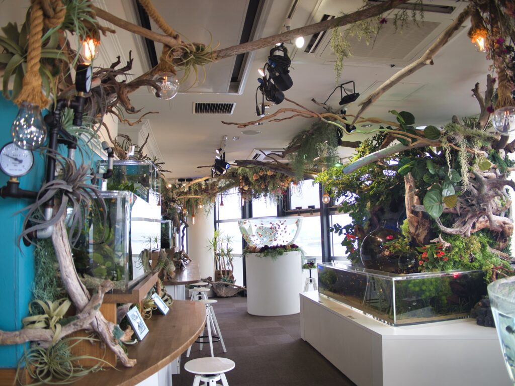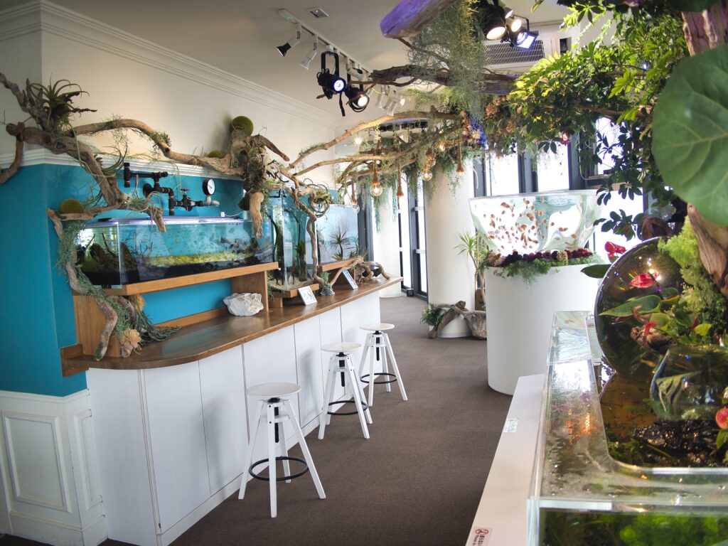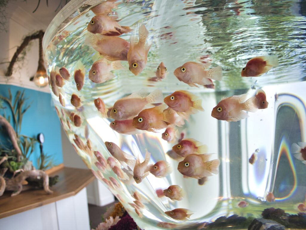 特徴的な形の水槽と、周囲に配されたフェイクグリーンが印象的で、まるでアクアリウムカフェのような明るさと癒しの空間でした。