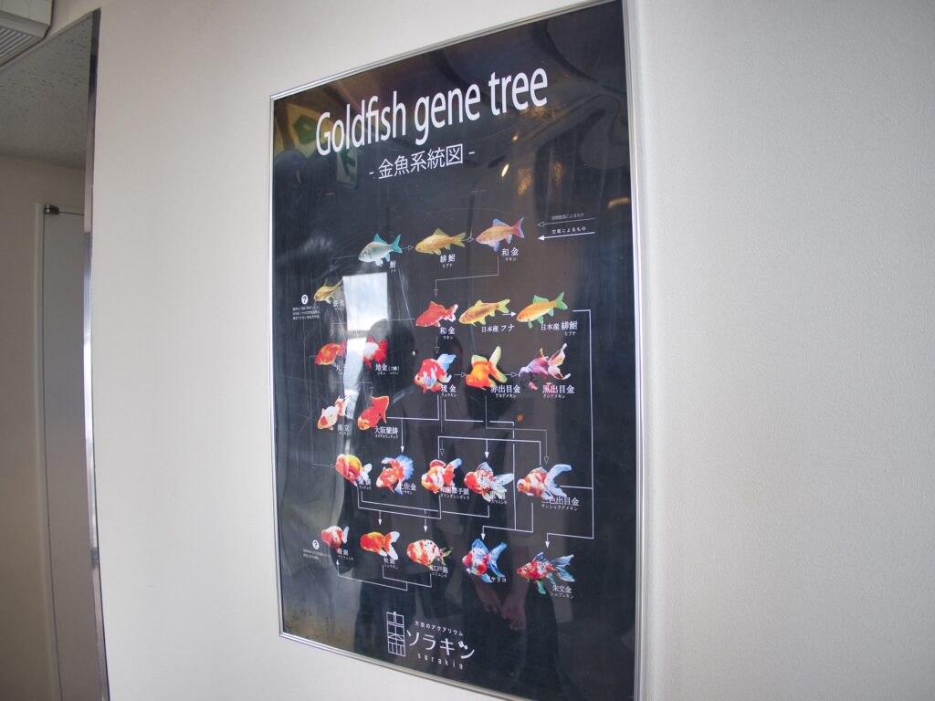 館内の展示パネルには、金魚の系統図が掲示されており、その祖先として「フナ」が紹介されていました。