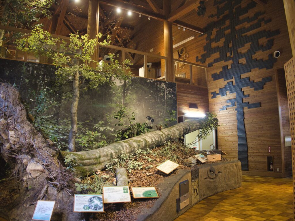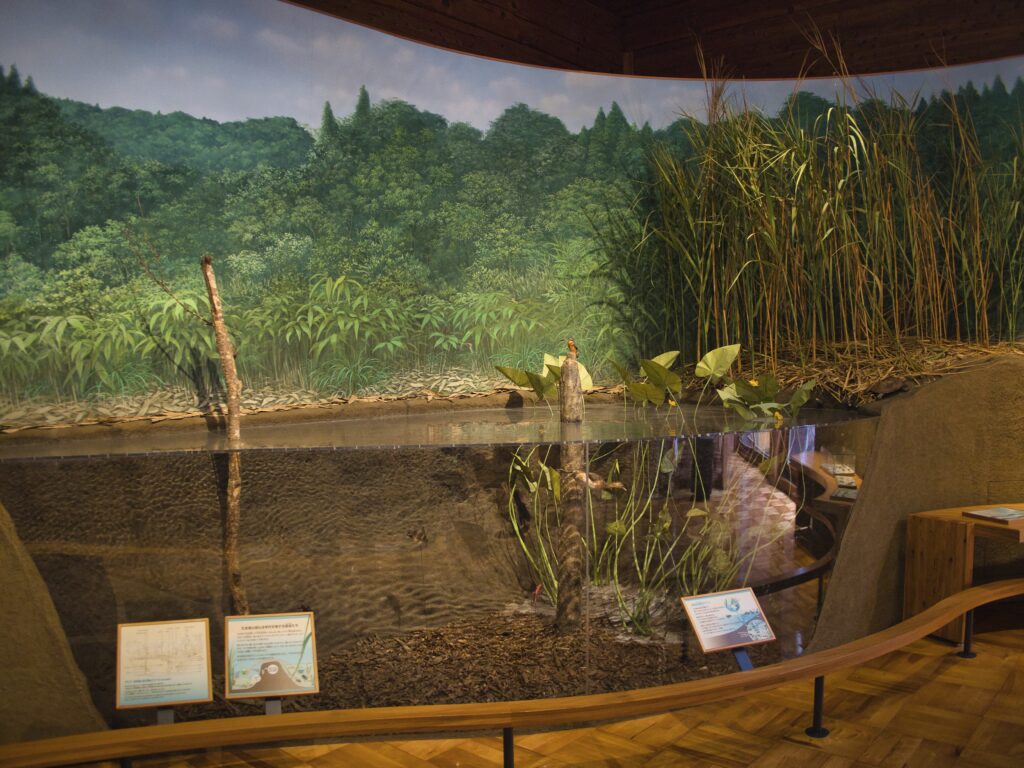 福井県立自然保護センターは、屋内にいながら自然とのつながりを感じられる施設です。入口の大型アクアテラリウムでは、カメとフナが共に暮らす姿が見られ、奥の展示ではジオラマを通して福井の自然環境を学ぶことができます。