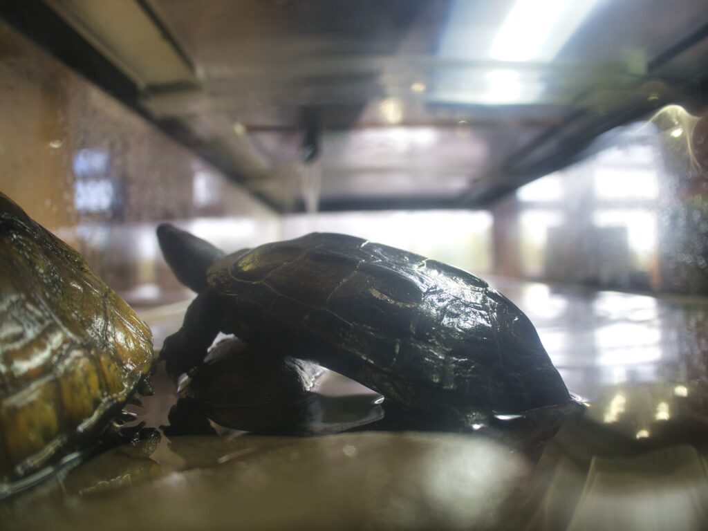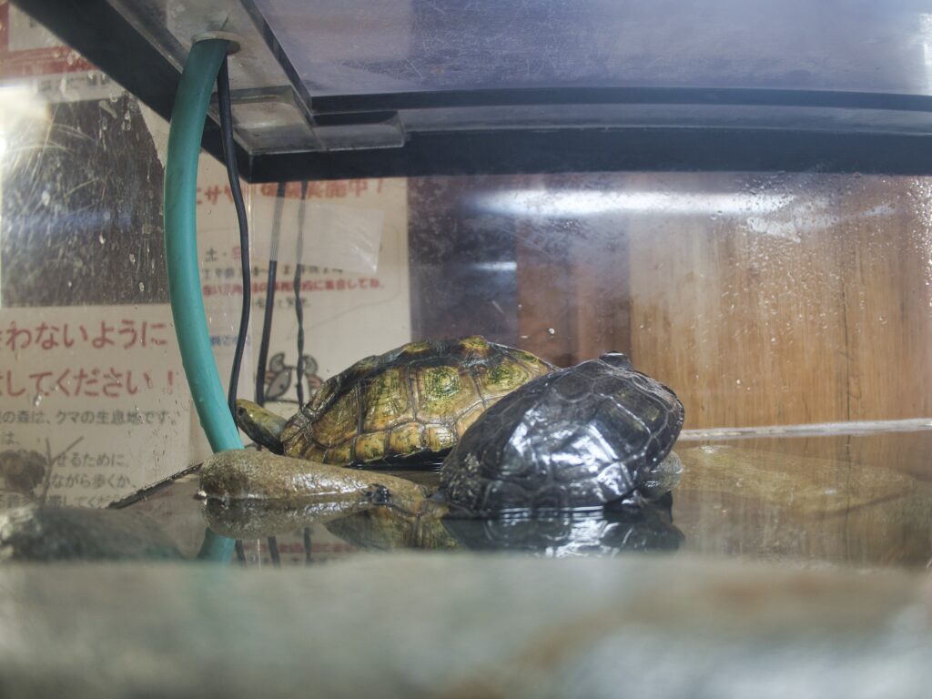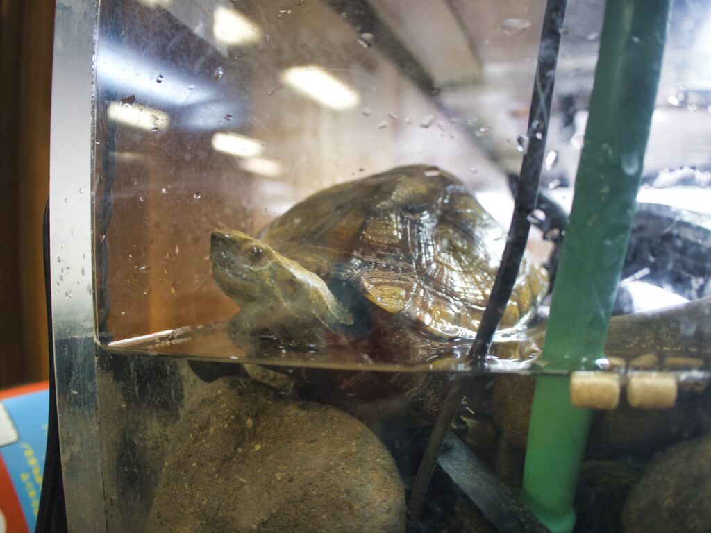 水槽の主役はカメたちで、クサガメ、イシガメ、そして大型のスッポンの3種類が確認できました。