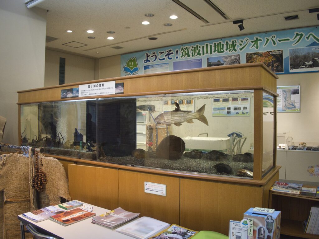 展示の主役はギンブナで、体長10cm前後の個体が15匹ほど確認できました。隣接水槽にはコイも展示されており、霞ヶ浦を代表する淡水魚の構成になっています。