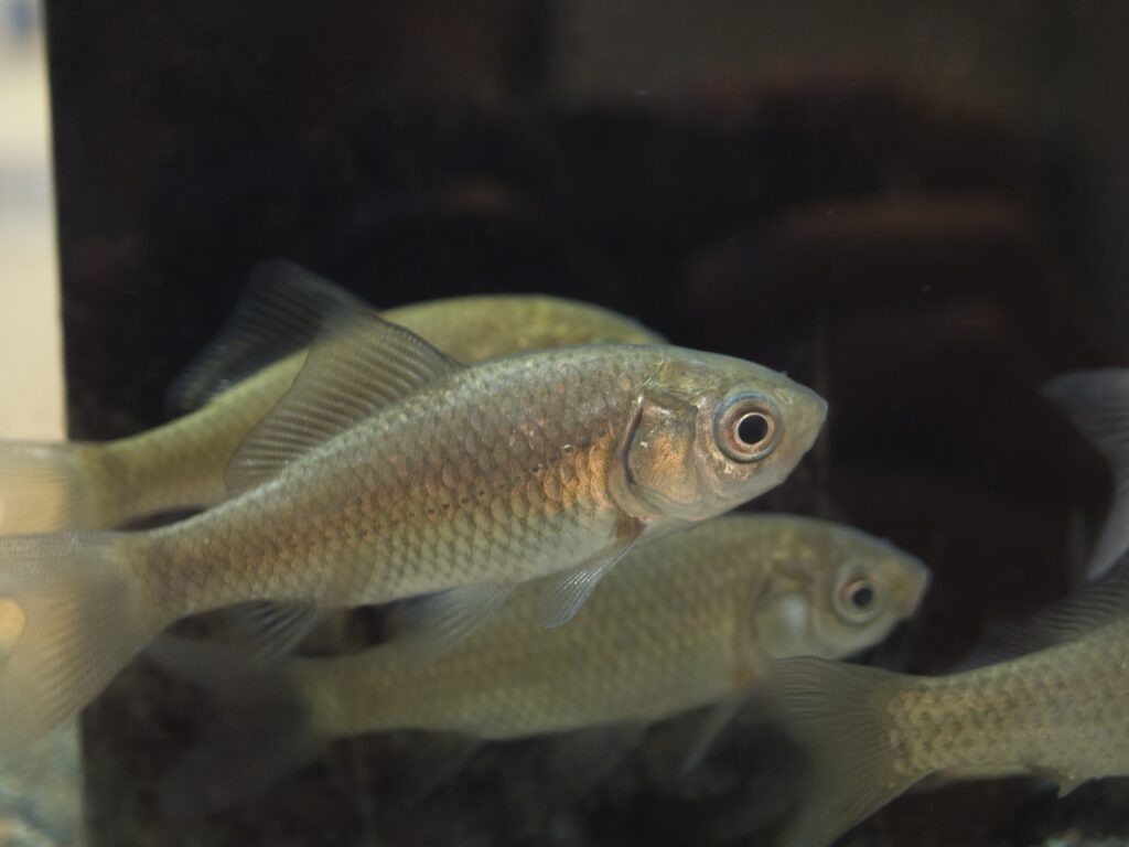 個体をよく観察すると、フナの中には各鰭がやや短くなっている個体が見られました。