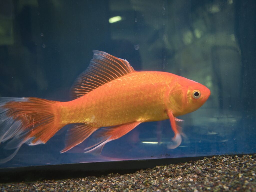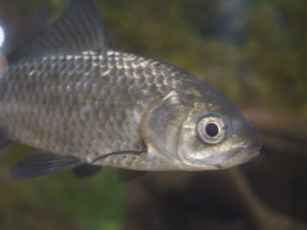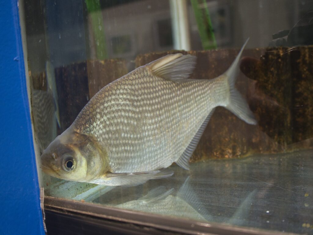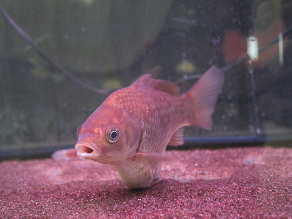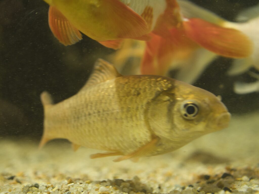 館内に入ってすぐの場所には複数の水槽が並び、そのうち3水槽がフナ類の展示となっています。ここでは、オオキンブナ、緋色が美しい鉄魚、そして透明鱗ヘラブナを見ることができます。